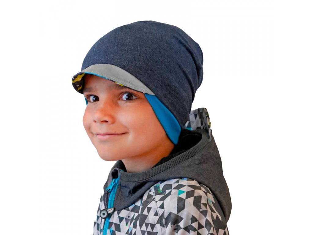 Dětská čepice z teplákoviny s reflexním kšiltem spadená, jeans temný, Autíčka