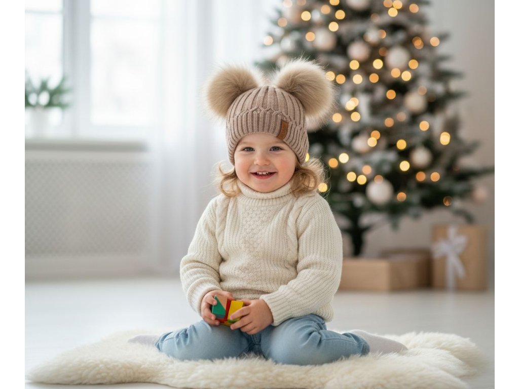 Merino čepice pro děti s bambulemi - Beige