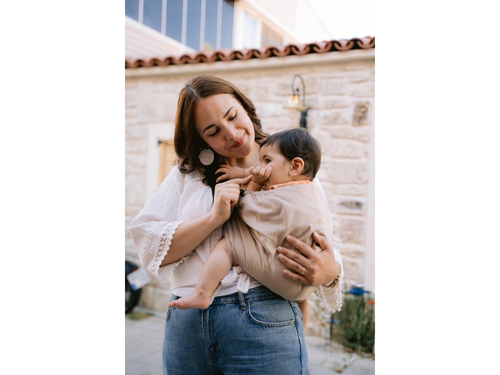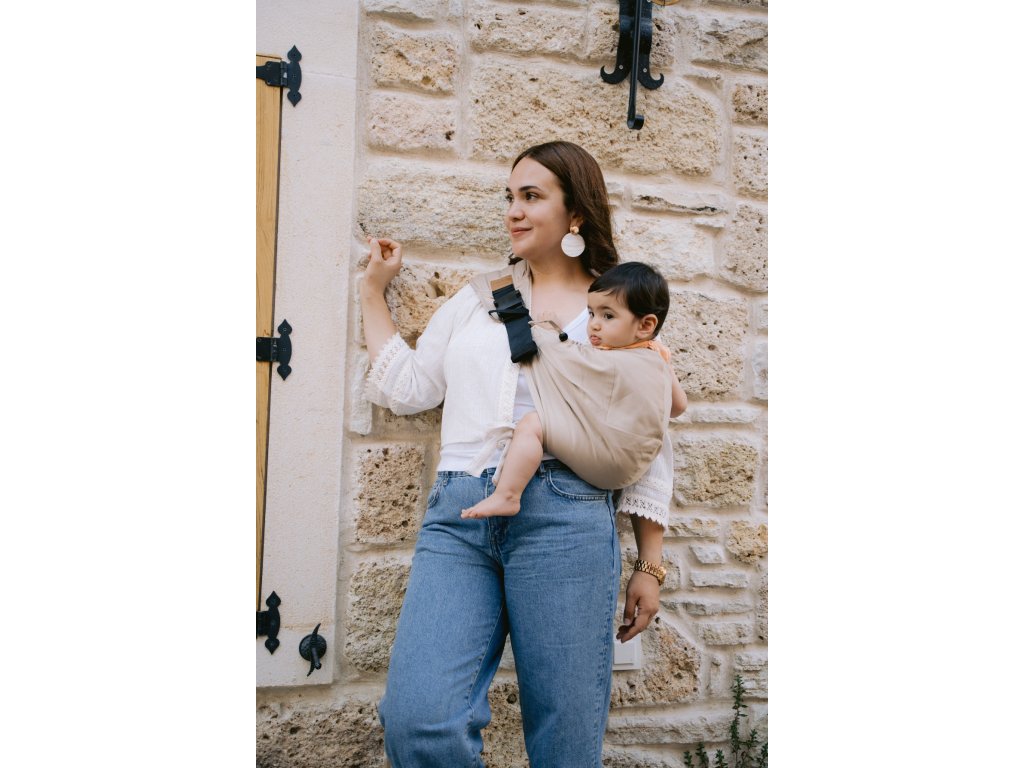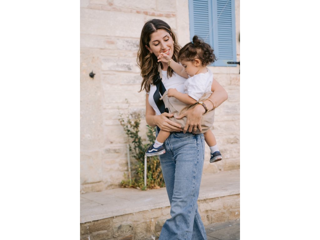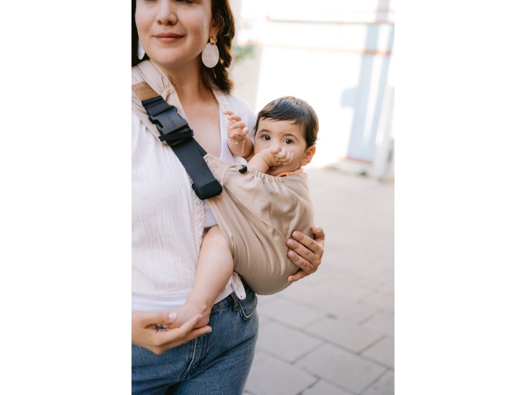 Nosítko je ušité z jemné organické biobavlny s certifikací GOTS – takže je šetrné k citlivé pokožce a krásně prodyšné. Nasazení? Jednoduchost sama. Žádné složité skládání nebo vázání – prostě nacvaknout přezky a můžete vyrazit.