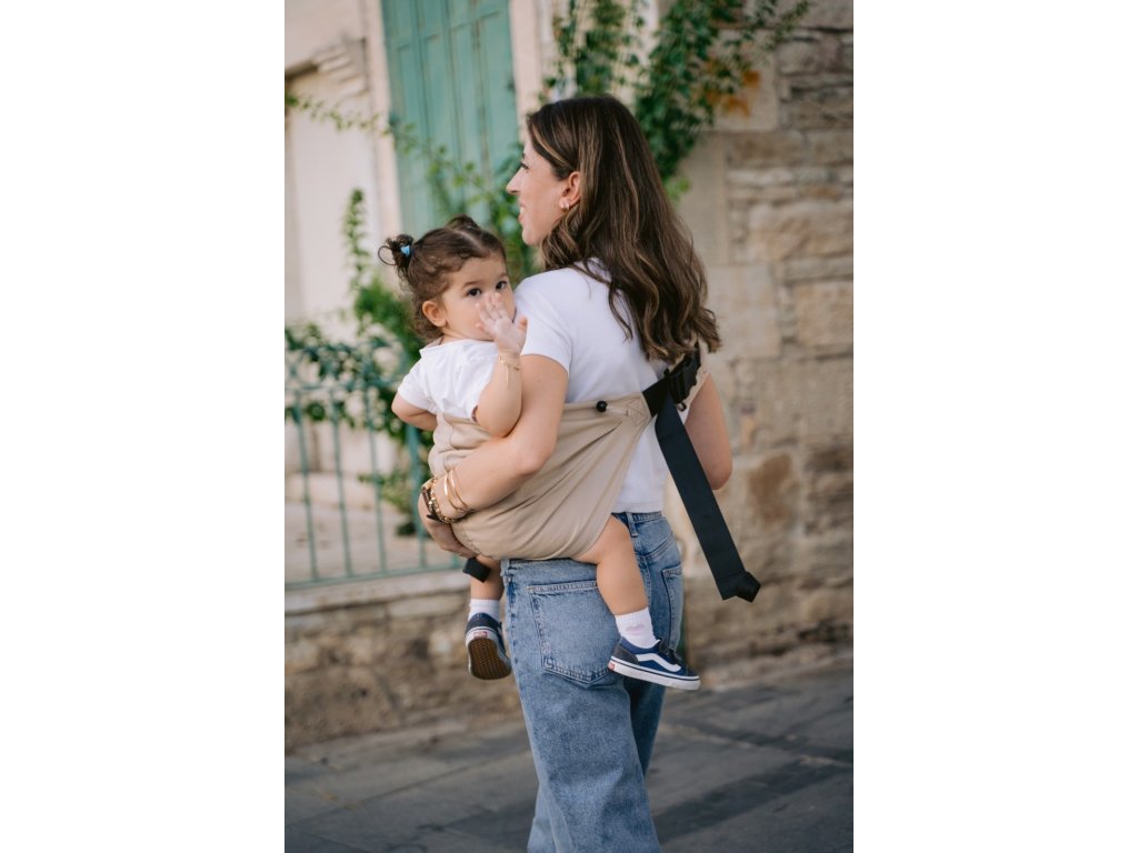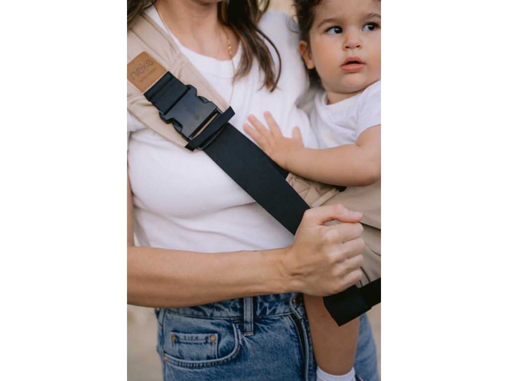 Nosítko je ušité z jemné organické biobavlny s certifikací GOTS – takže je šetrné k citlivé pokožce a krásně prodyšné. Nasazení? Jednoduchost sama. Žádné složité skládání nebo vázání – prostě nacvaknout přezky a můžete vyrazit.