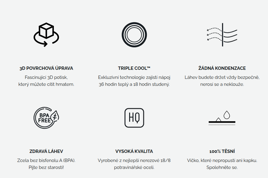 Jakmile tuto termoláhev vezmete do ruky, už ji nepustíte. Rozdíl oproti jiným láhvím je v použité technologii, kvalitě zpracování, jedinečném designu a v povrchové úpravě s velmi odolným práškovým lakováním a unikátním 3D potiskem. Když se láhve dotknete, budete šílet, protože ucítíte reliéf kresby. Láhev se nerosí, a proto vám ani nebude klouzat v ruce. Víčko je vzduchotěsné a nepropustné - 100% těsní.