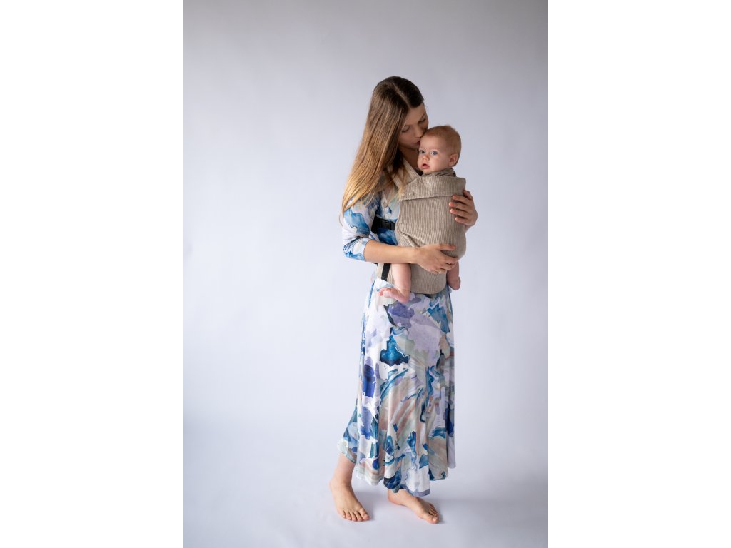 Bederní pás a nastavení šířky panelu na něm je totální inovací, kterou jinde nenajdete. Díky použití popruhů na nastavovací pásce opatřené váhou dítěte je možné nosítko velmi přesně nastavit, panel se nikde neshrnuje, ale velmi esteticky se skládá do záševků.
