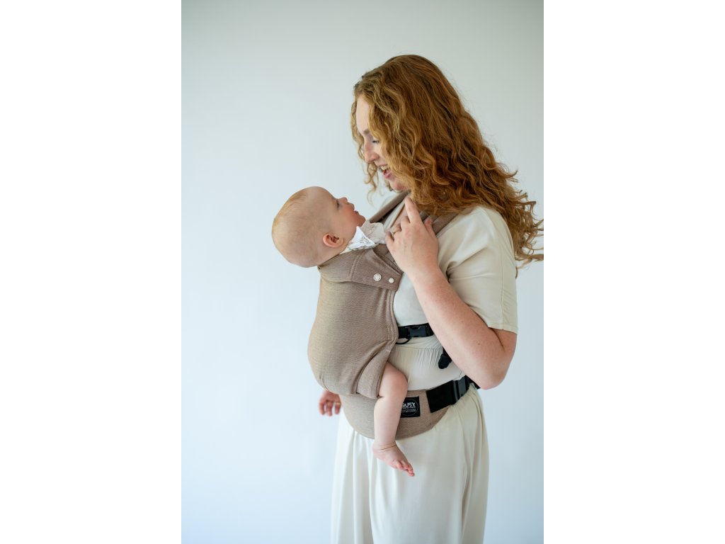 Bederní pás a nastavení šířky panelu na něm je totální inovací, kterou jinde nenajdete. Díky použití popruhů na nastavovací pásce opatřené váhou dítěte je možné nosítko velmi přesně nastavit, panel se nikde neshrnuje, ale velmi esteticky se skládá do záševků.