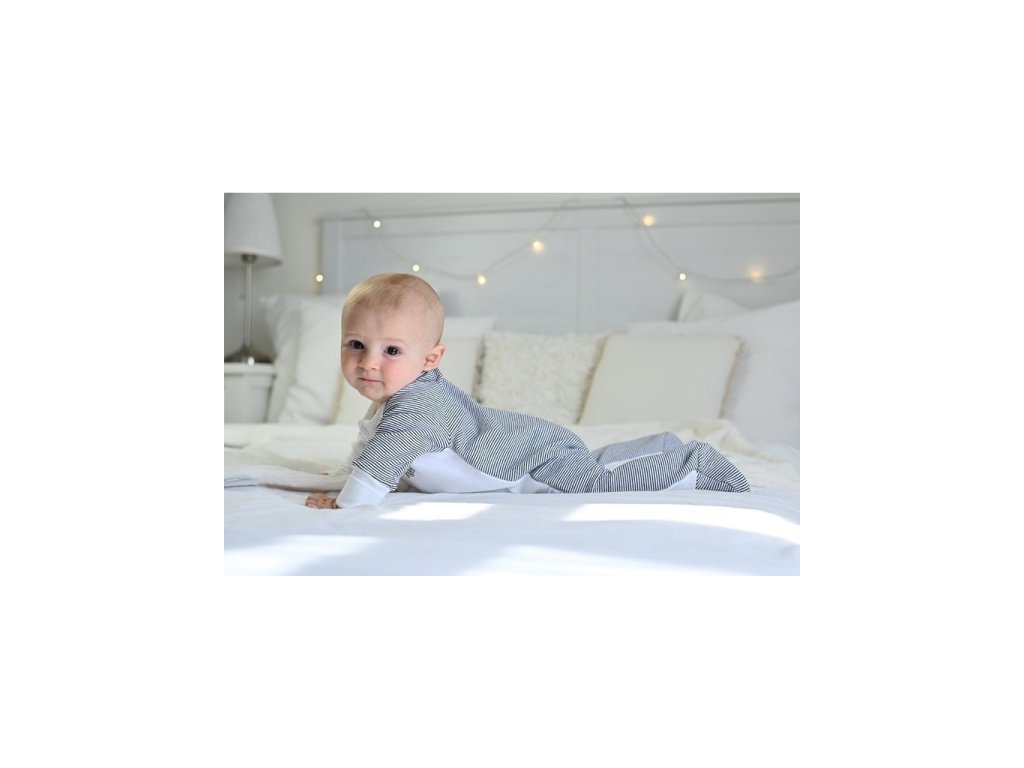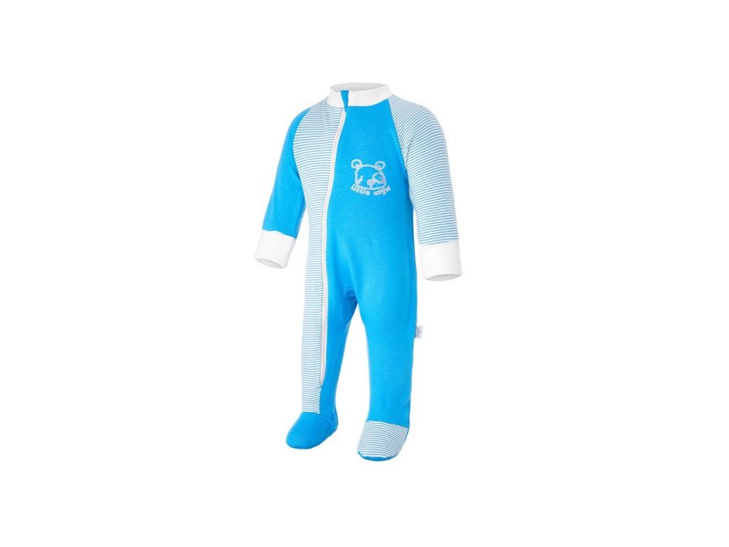 Pohodlný dětský overal je střižen ze slušivé kombinace dvou vzhledově rozdílných materiálů - jedné barvy a módních pruhů. Overal má dupačkové nohavice a u krku je zakončen stojáčkem. Rukávy jsou dlouhé a mají široké náplety, které můžete v případě potřeby ohrnout a upravit tak délku rukávů podle aktuální potřeby. Overal se zapíná na dlouhý zip, který usnadní oblékání. Po zapnutí lze jezdec zipu schovat do speciální krytky pod bradou, a zabránit tak otlačení brady. Přední stranu overalu zdobí potisk s motivem zvířátka. Overal má uvnitř nažehlené etikety, které netlačí a nadráždí jemnou dětskou pokožku.